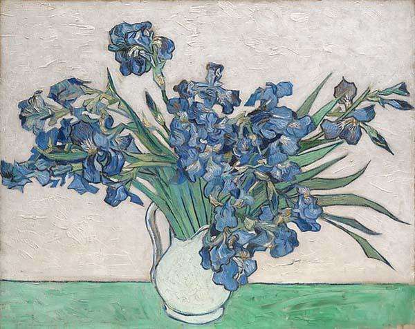 经过研究人员发现,梵高在这一时期使用的合成颜料中有一种以“水白铅矿”为原料的红色颜料,这种物质与空气中的二氧化碳接触会分解成白色晶体,导致在绘画中所有与添加红色调和而成的颜色发生了“褪色”,而整个画面中的红色也几乎消失。比如,蓝白色调《鸢尾》的墙面原来也许是粉红色的,且鸢尾的蓝色应比现在所看到的更偏紫。