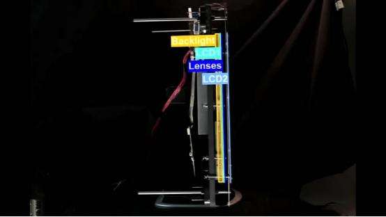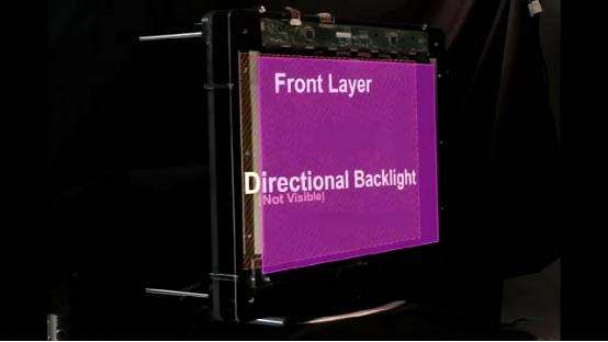 这个投影仪的核心部件是两道LCD液晶屏,它们工作时如同被安装在背景光源和镜头之间的两个微型LCD显示器。第一道LCD屏幕产生特定角度的图像,这些图像以特定的角度经过第二道LCD屏,之后图像通过一系列像开普勒望远镜那样排列的镜头,再穿过一个由多条垂直透镜组成的透明投影屏,这个透明投影屏有点像那种从不同角度可以看到不同画面的3D立体画上用到的折射塑料片。这样形成的画面,从8个不同的角度上观察,可以感到画面中物体的视角变换。