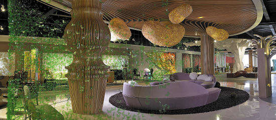 展厅最大的陈设:线条舒展的挺拔大树、树上垂下的绿色枝叶、树下舒适的座椅,一派生机勃勃的意象