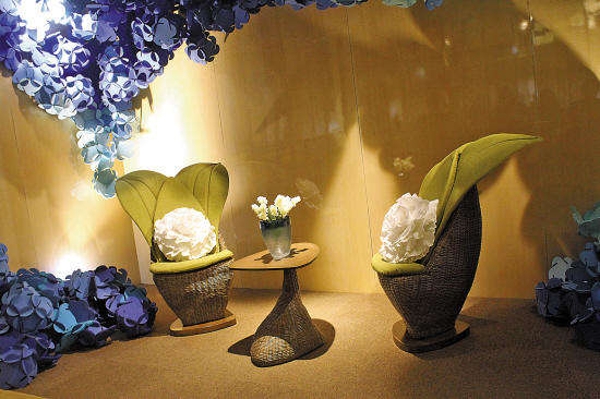 大树成长,绿色垂帘仿佛柳枝漂浮,树下圆弧状的沙发和茶几,以及周边仿奶牛的组合沙发、仿云朵、仿蘑菇、仿花朵的各式家具,无不给广美陈设专业毕业展的这个展厅带来梦幻感和创意。而且更为新奇的是,这个展厅,同时是一家家具企业。