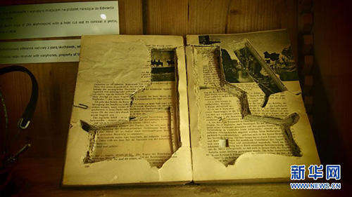 这是波兰克拉科夫城市历史博物馆二战展厅展出的一本中间掏空以便藏匿武器的书,为了对抗纳粹,地下组织人员想尽各种办法藏匿武器(2015年4月6日摄)。位于波兰南部的克拉科夫是一座闻名遐迩的历史文化名城,第二次世界大战期间被德国法西斯占领。与华沙等几乎完全毁于战火的波兰城市相比,克拉科夫还算“幸运”,因为它的多数古老建筑得以平安保存下来,但当地的居民同样受到了纳粹的残酷奴役、压迫甚至杀害,数以万计的犹太人和抵抗人士被关进集中营,其中只有很少一部分人活到了战后。臭名昭著的奥斯威辛集中营就位于克拉科夫附近。克拉科夫城市历史博物馆是克拉科夫城市博物馆的一部分,分布在该市的各个区域,每个区域都有一个展示厅,分别展出不同的历史文物,其中二战展厅专门展示克拉科夫在被德国纳粹占领期间的情况。二战展厅的展品主要有照片、文件以及实物等,大多是战后从各个集中营中收集到的,其中包括集中营被关押者们书写的约800封信件。这一件件展品静静地摆放在那里,无声地控诉着法西斯的暴行。