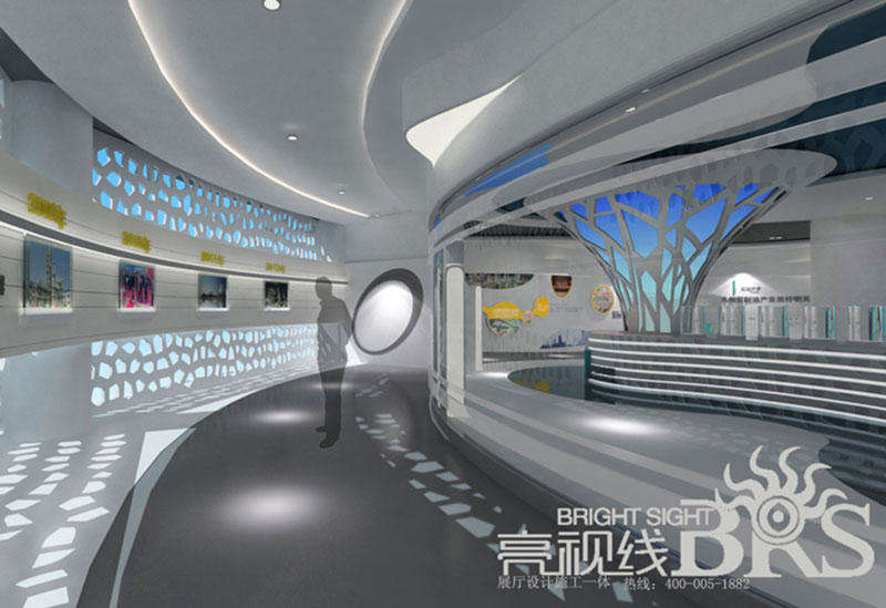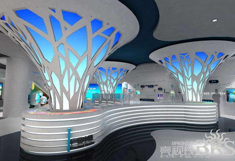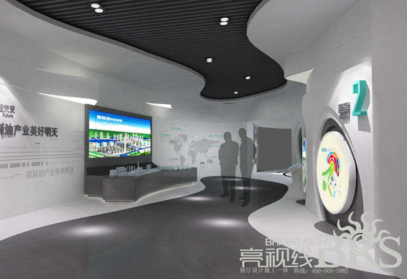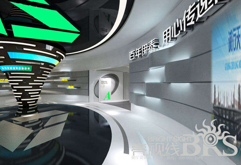 内蒙古伊泰企业展厅是以“黄金螺旋”划分展厅空间,弧线墙体丰富了视觉体验,扩大了空间的视觉感受。以白色、蓝色为主,点缀青草绿色,将企业文化与地域特征和空间艺术完美结合,更体现企业的环保低碳,将“能量传递”这一过程抽象为一种建筑符号,从一而终,与“用心传递能量”的空间主题交相呼应,使得展厅更完整更连贯,为观众呈现出一个纯粹、冼练、流畅的企业展厅。