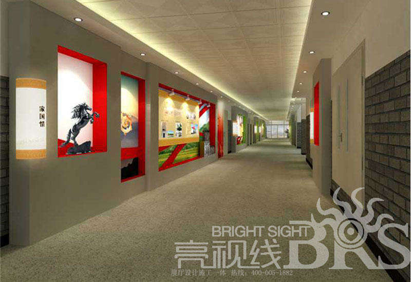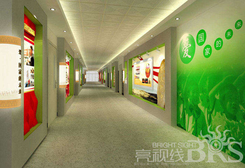 北京农大附中教育展厅根据其特有的教育环境,以灰色和白色为基色,板块中的彩色展板作为画龙点睛之笔,与环境中的灰色墙砖相呼应,使展厅的色调统一,空间设计以爱为设计主题,各个板块以一条爱的纽带相连,贯穿始终,板块与板块之间既有联系又蕴含着不同的涵义,每个板块以橱窗的形式展示出各种不同种类的爱,配合各个爱所处的不同环境有喻义的物件,打造出一个环境艺术的文化氛围,体现出展厅文化氛围浓厚的空间感,将爱的主题诠释的更加透彻。